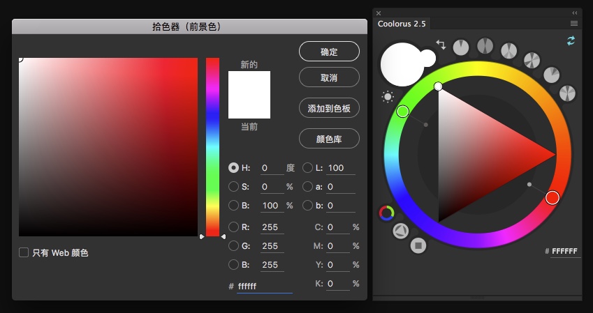 所以,我自己一点也不喜欢用PS的正方形拾色器(左),仔细观察左边的拾色器你会发现最下面那一条黑色根!本!没!有!差!别!。反而类似painter里的三角形拾色器设计得就非常直观(右),上面是明度,左右是饱和度,外轮是色相。而且明度提升一定会影响到饱和度的改变。截图里的ps插件名为:coolorus。15美刀。是我买过的得最值的ps插件,强烈安利给大家。