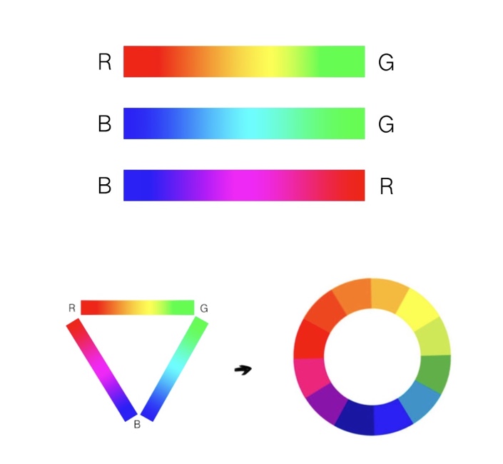 假如我们眼睛能看到三种原色,那么我们就有下面这几种过渡: