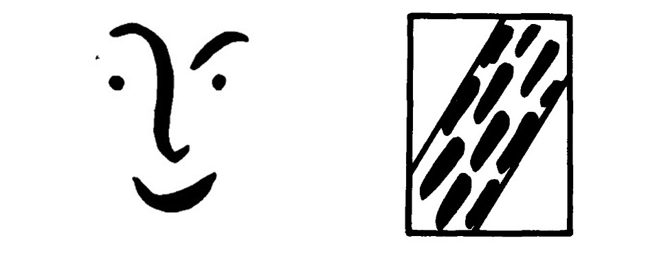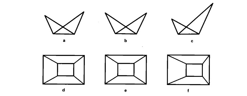 当我们把上图a给人们看过后让他们记忆,尽管大部分观察者在他们的重绘中(b、c)表现出一种减少结构特征数量、并以此达到简化图式的趋势,但是还有其他一些人们会通过『强化细分』的方式将微弱的不对称性夸张出来,这同样也是将模型的简化,只是采用的方法相反而已。他们没有减少结构的特征数量,而是给图形赋予更显著的特征,从而使图形之间有所区别。