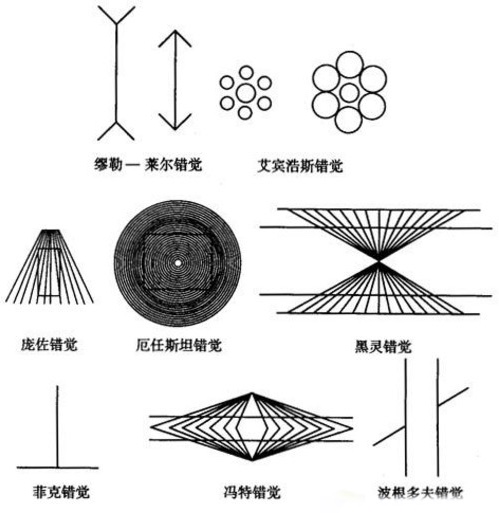 但是在人们知觉中的形状,却会随着空间方向与空间环境的变化会变化,并且形状与形状之间也会产生相互的影响。我认为这里的『变化』与『影响』非并客观上的说法, 而是人们在观看它们的时候大脑会根据某种经验或者机制自动的『加工』它们,让他们看上去更大或者更小、更直或者更曲……有无数有趣的视觉错觉实验证明过此观点: