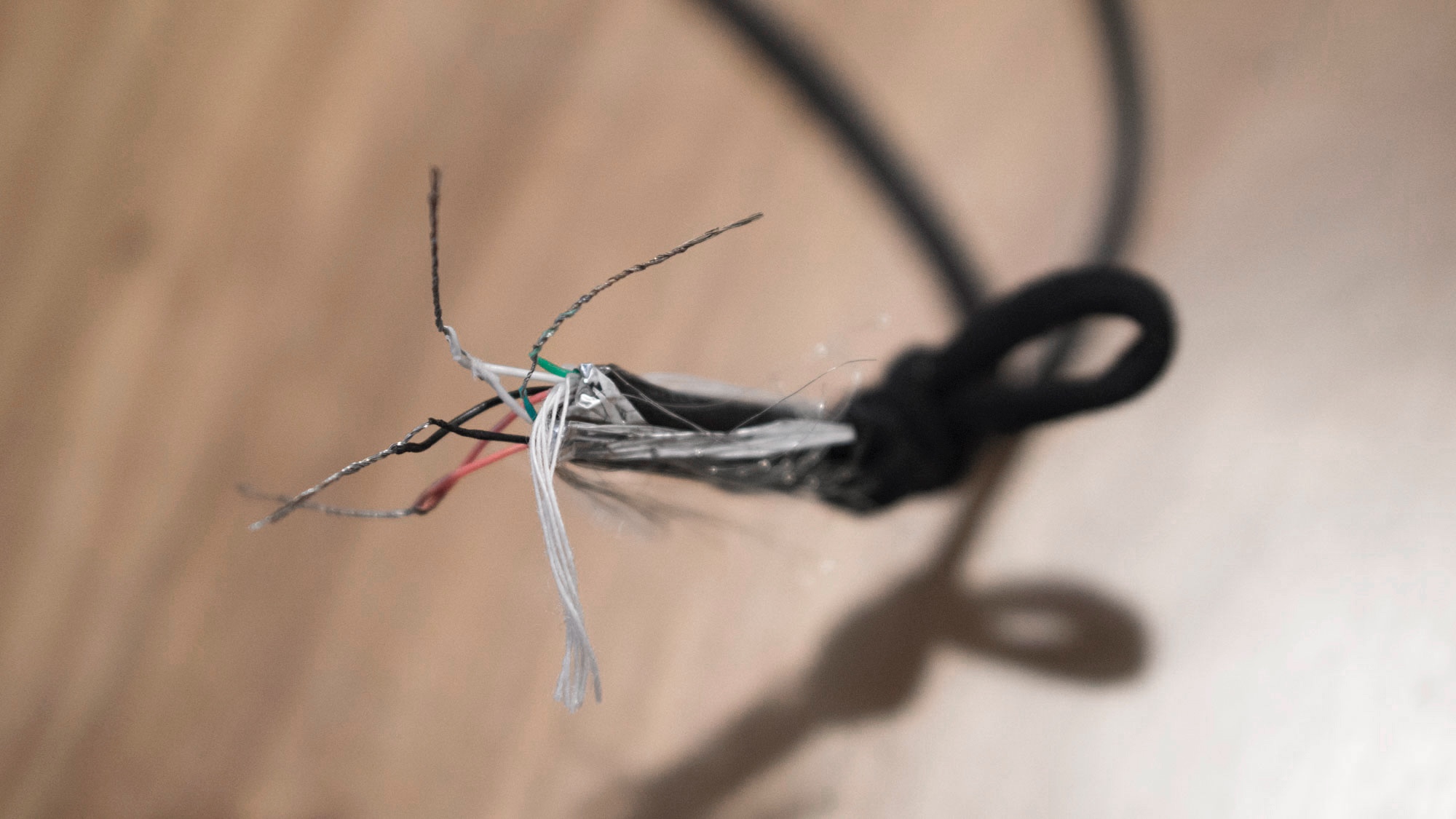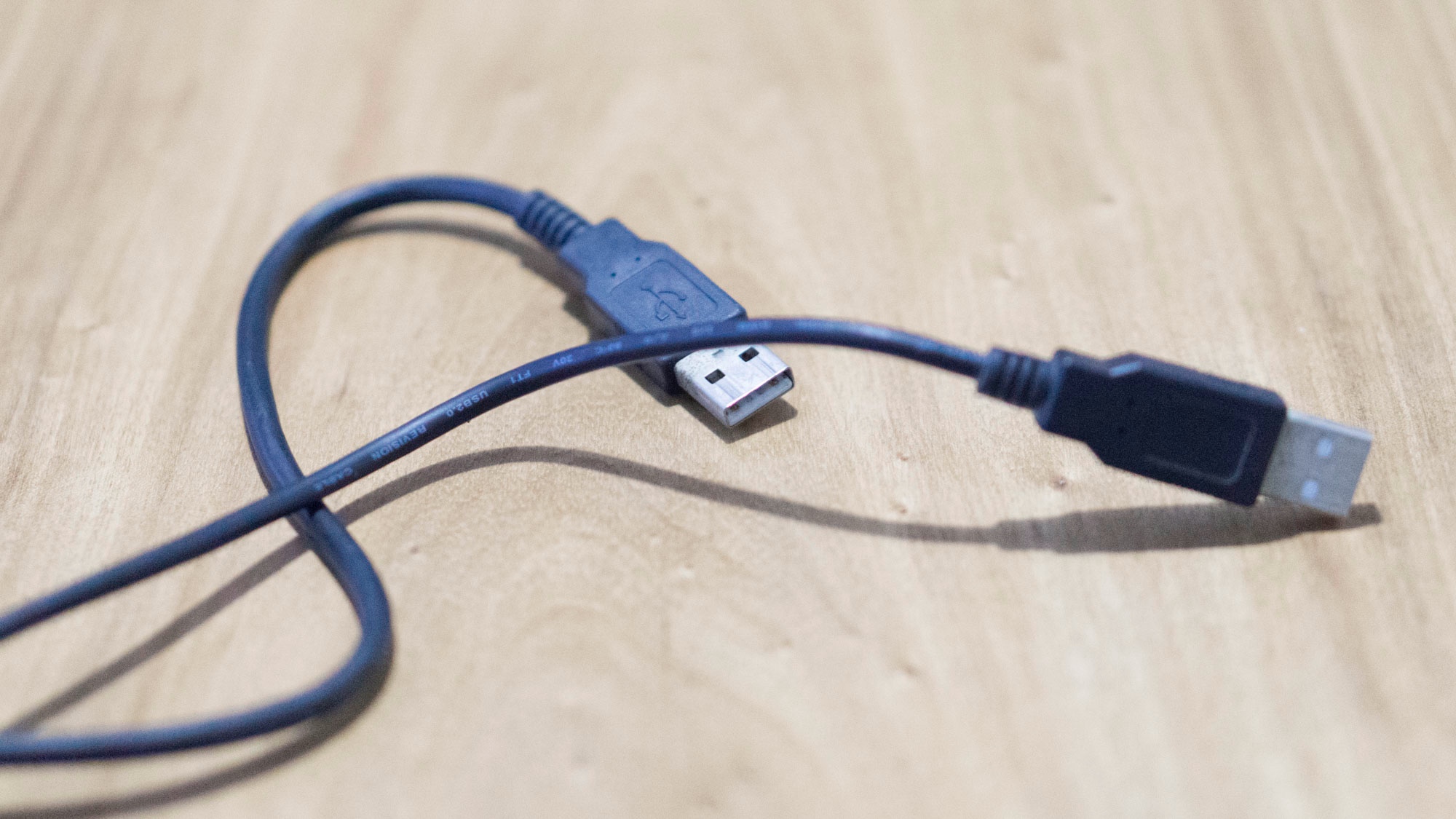 首先这个公对公的 USB 线就难到我了,所谓公对公也就是两头都是 USB 接头的线。我找了半天在家里找出了两根 USB 延长线,想了想反正放在那也用不着,一狠心就把它们剪了对接起来。USB 线里面有四根芯,分别是:红、黑、白、绿。顺序上没什么讲究,相同的颜色绑一起就好了。如图,原谅我这手殘党。