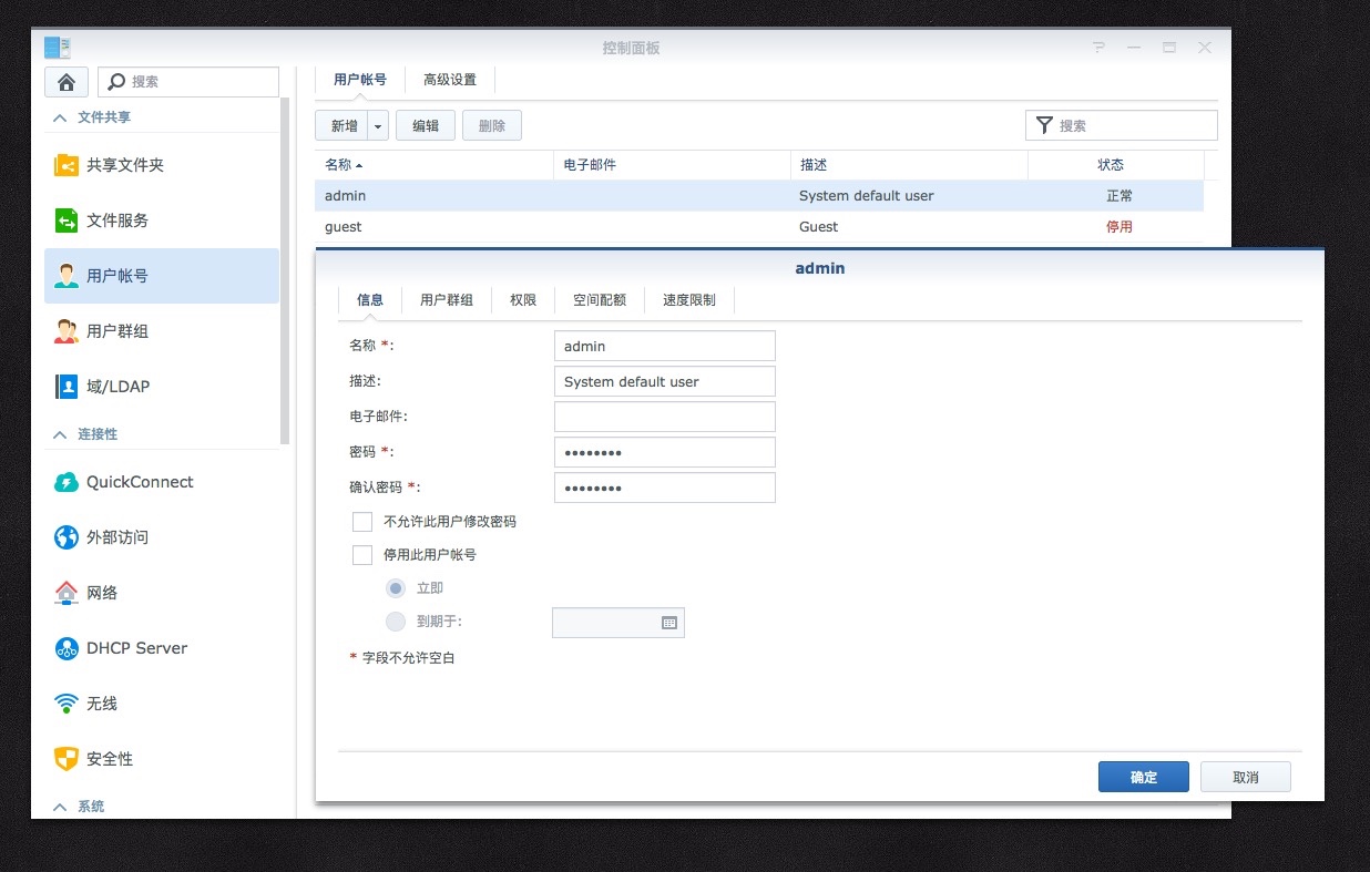 然后把NAS里的administrator用户打开,因为Resilio Sync必须用它的权限,即使你的当前用户有admin权限好像也是不行的。在这里把停用此用户账号取消勾选: