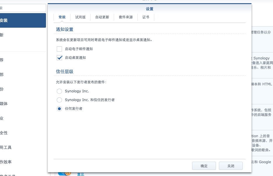 进入套件中心-已安装-设置-信任层级-任何发行者